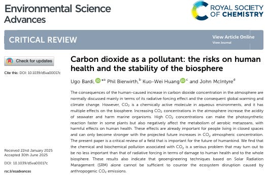 The CO2 perturbation is known in sectors such as ocean acidification, and the increase of vegetative rates for some plants — called “global greening.” (*) But much less is known, and even less perceived, about the metabolic effects on humans and other mammals. So, we (Ugo Bardi, Phil Bierwirth, Kuo-Wei Huang, and John McIntyre) decided to plunge into the matter and create a comprehensive review on the subject. Our paper on CO2 was published last week on “Environmental Science Advances”, a journal of the Royal Society of Chemistry. We found that the current concentration of 425 ppm is not far from levels that can negatively affect people’s health, and we breathe much larger concentrations indoors. In addition, we keep it increasing by about 3 ppm every year. What are we doing?