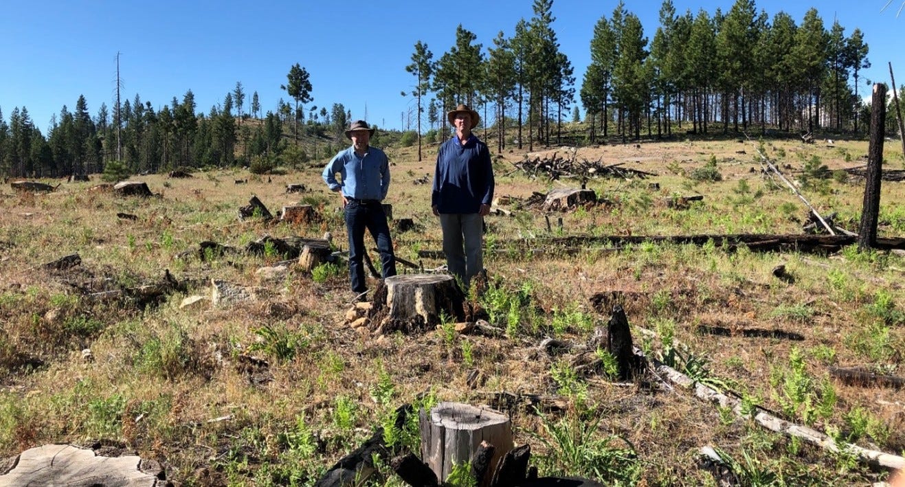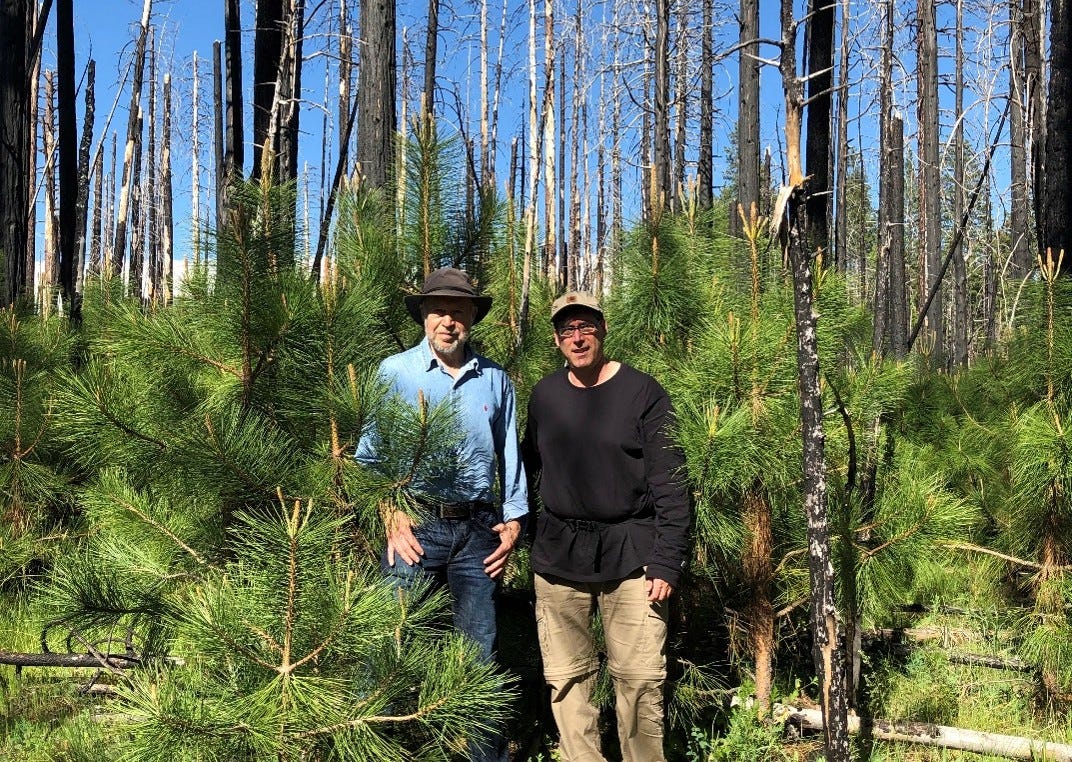 Fig. 1. James Hansen and Chad Hanson in Stanislaus Forest just west of Yosemite in June 2021, in an area “rescued” by the United States Forest Service following the 2013 Sierra Nevada Rim fire.