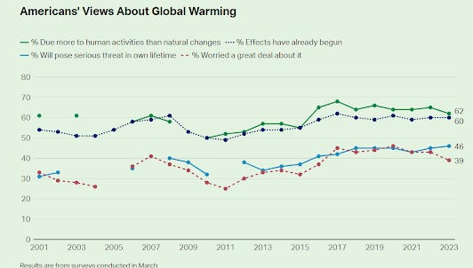At present, we are at about the same level of concern as 20 years ago, and the temperature records of 2022 and 2023 had no impact on public perception. On the contrary, from what you can read on social media, they generated a strong counter-reaction among large numbers of people who claim that it is all a scam to enslave them.